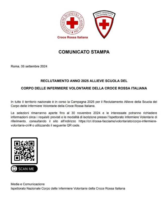 “Una missione che nasce dal cuore” quella delle Infermiere Volontarie della Croce Rossa Italiana che, come ogni anno, offrono alle aspiranti allieve l’opportunità di partecipare alla Campagna nazionale di reclutamento 2025 le cui selezioni rimarranno aperte fino al 30 novembre 2024.